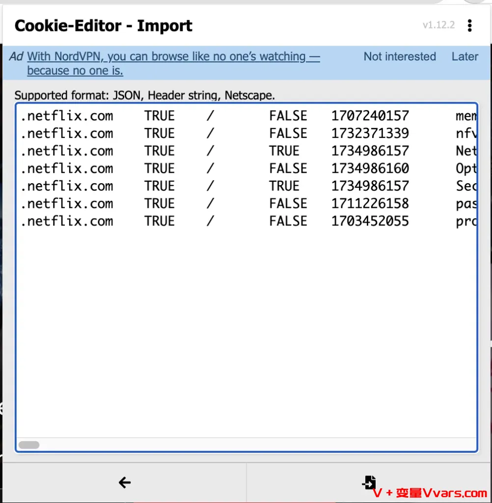 将下载下来的Netflix cookies复制下来,点击import粘贴到空白区域